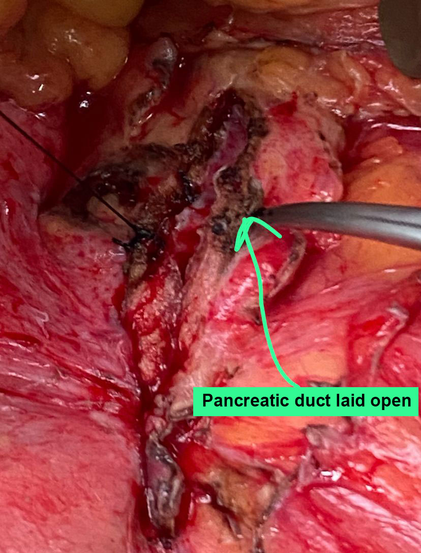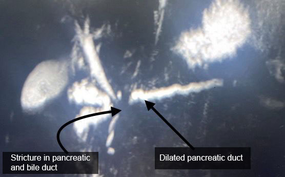 52 year old lady with chronic pancreatitis was referred to us for management. She had history of severe acute pancreatitis 2 years back. It had led to a stricture in the neck of pancreas and resulted in chronic pancreatitis. When she approached us, she had a recent unsuccessful endoscopic attempt to remove stone in the pancreatic duct and stent insertion. The attempted ERCP however had caused damage in the form of an attack of acute pancreatitis and further increase in the inflammation around bile duct causing its narrowing.