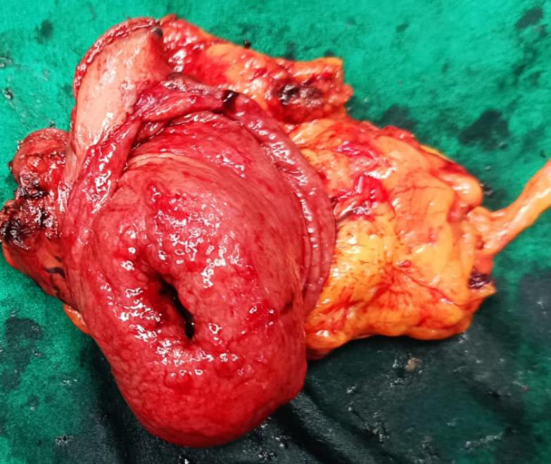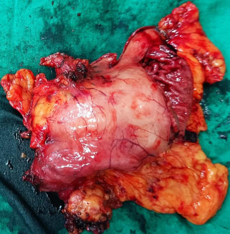 70 year old gentleman came with complaints of fullness of abdomen, vague abdominal discomfort and weight loss. He had a palpable upper abdominal lump. His old investigation s showed a gastric tumor that was gradually increasing in size over few years. His fresh investigations showed that the tumor had further grown, was ulcerated inside the stomach & was causing obstruction to passage of food from stomach to intestines. He also had gallstones & significant constipation. PET CT did not show any spread except a lymph node in the vicinity of tumor. Since patient needed a surgery (obstruction, ulceration, bleeding) and the tumor was resectable; he was subjected to surgery without biopsy. A laparoscopic distal radical gastrectomy (lymph node clearance) (image 1) was performed followed by gastrointestinal reconstruction. Simultaneously laparoscopic cholecystectomy was done for gallstones. Patient was sent home on day 6. The final histopathology was GIST. Based on the detailed histopathology, patient was started on oral chemotherapy.