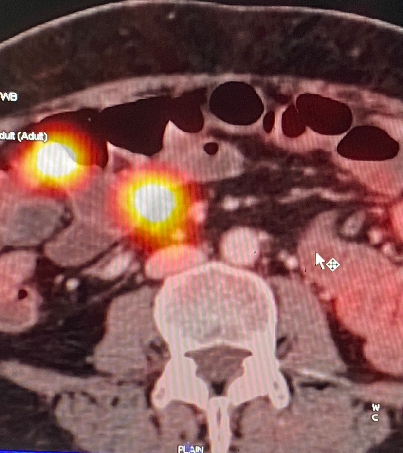53 year old lady presented with weight loss, weakness, anorexia, loose motions, abdominal discomfort & melena. Her CT scan of the abdomen & pelvis showed a small intestinal tumor with lymph node mass suggestive of a NET. Further work up with DOTA-PET confirmed it as a NET. It also showed a tiny metastatic tumor in the liver. Tumor marker work up with chromogranin and 24 hour urinary 5-HIAA showed the former having normal levels and the later raised significantly further confirming the SI-NET with a functioning component like a carcinoid disease.